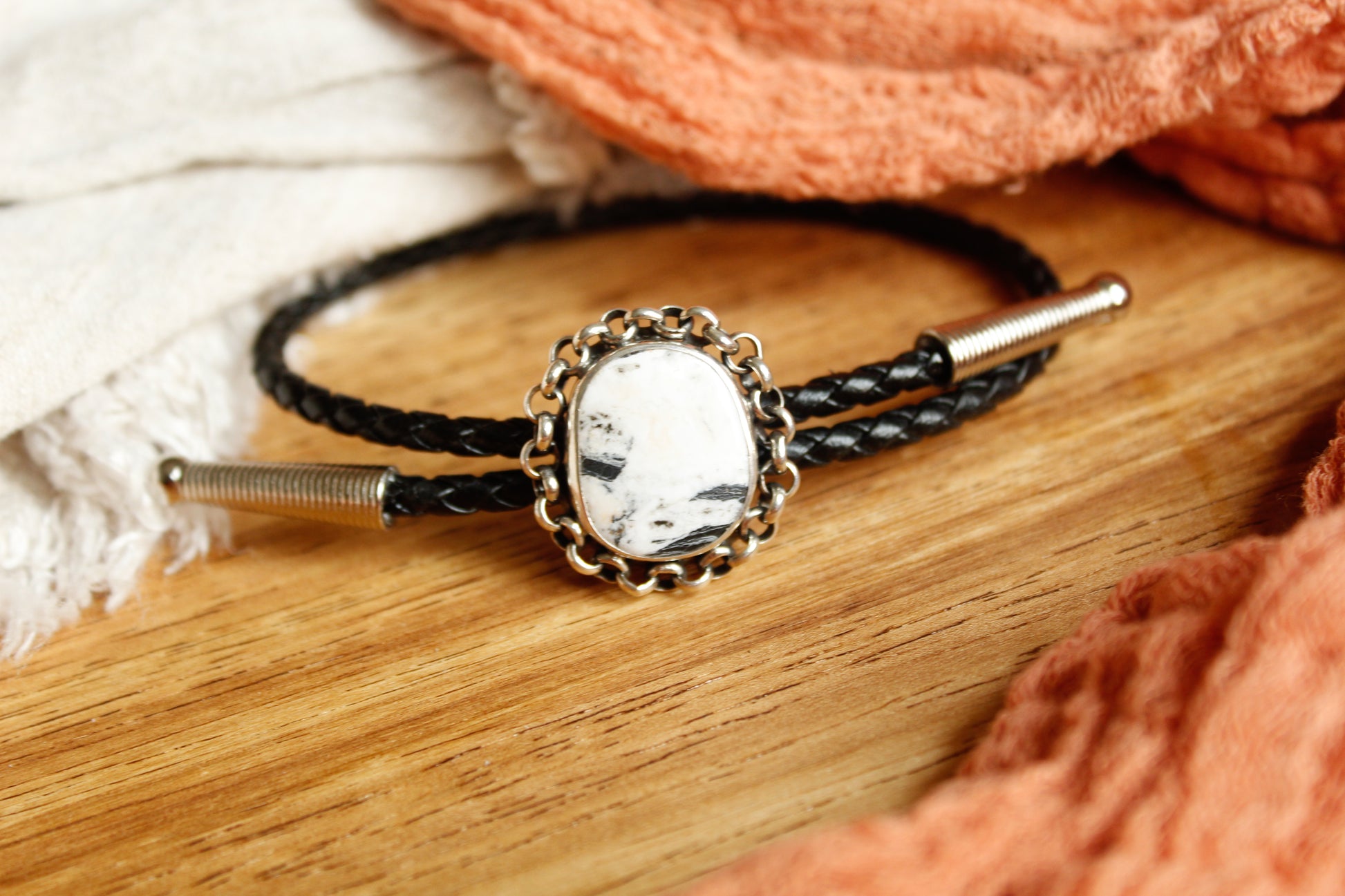 Made from .925 sterling silver and braided leather cord, stone is White Buffalo
